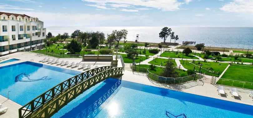 260Adrina Termal Health & SPA Hotel 5* находится в турецком городе Эдремит на берегу Эгейского моря. Это премиальный спа-отель, построенный на зеленой ухоженной территории площадью 39 000 м². Отдыхающих ждут открытый бассейн, собственный песчаный пляж с лежаками и зонтиками, пирс, сад и теннисные корты. Для маленьких гостей оборудованы отдельный бассейн, площадка для игр на свежем воздухе и детская комната. Гости с личными автомобилями могут воспользоваться охраняемой парковкой.