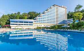 Классный пансионат с большим акав парком и водными горками. Есть веселая дискотека. Номера чистые и питание очень вкусное) находиться близко от моря что дает возможность каждый день гулять и отдыхать на пляже) территория пансионата красивая и облагороженая) подходит как для семейного отдыха так и для тех кто едит с дру...